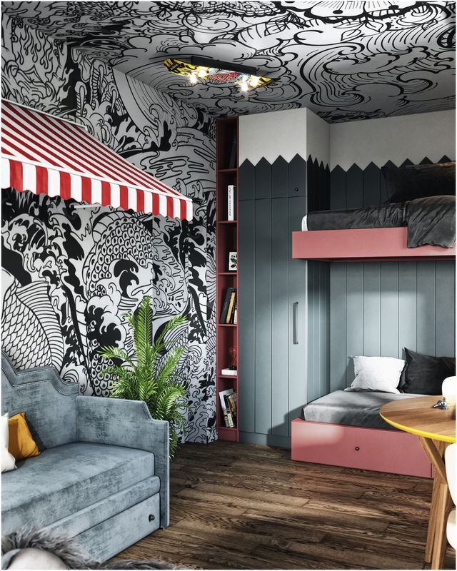 This apartment is a temporary location for a family with three children when they visit St. Petersburg. The main task was to place on a small area the main functions, separate rooms for parents and children, and provide a sleeping place for friends. Since they do not live in the apartment permanently, customers were ready for experiments and a bright interior.