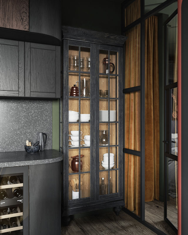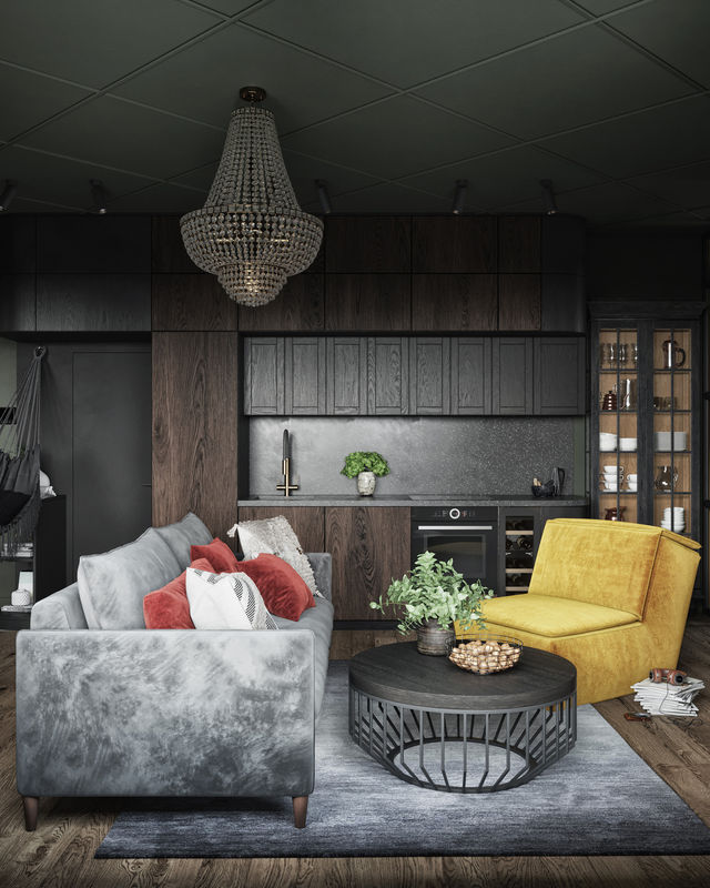 Темная и очень уютная квартира для мамы с сыном подростком. Небольшая площадь компенсируется огромными окнами, светопрозрачными конструкциями, которые не глушат разграниченные помещения. А темно-зеленый потолок создает ощущение безграничной высоты и пространства.