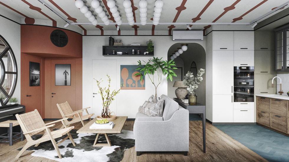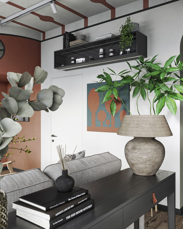 A calm colored apartment with bright accent ceiling in the living room is situated in Moscow. The main feature of the apartment is a gorgeous view to the great building of the Moscow State University and the Moscow City district. At the same time, the apartment is angular and the view of the city opens from the bedrooms, but not from the living room and common space, as it have to be. We solved the problem cardinally — we made a huge round window between the living room and the children’s room — there was a view and an opportunity to look for children from the living room.