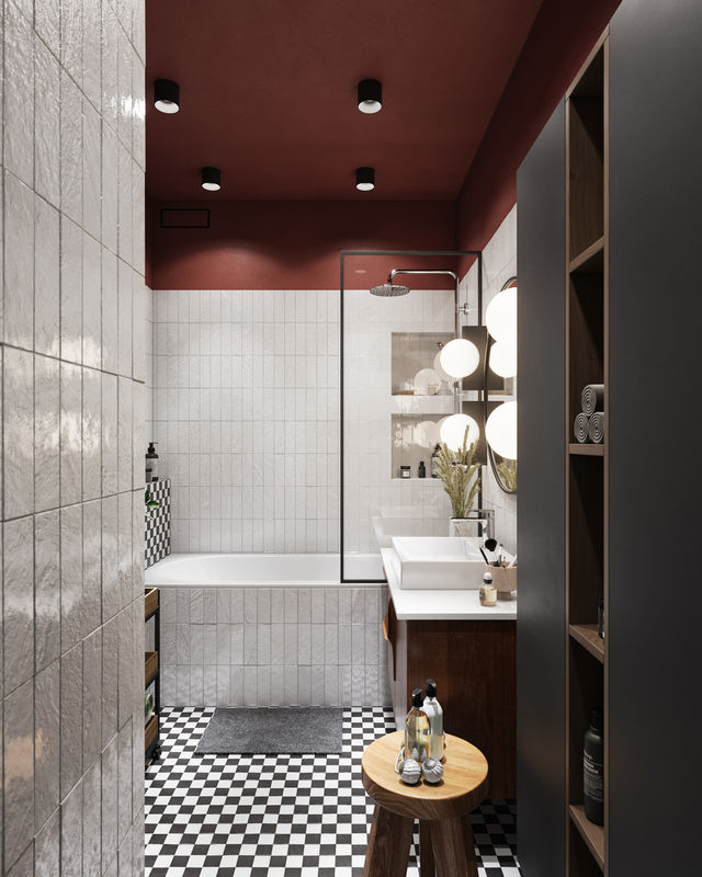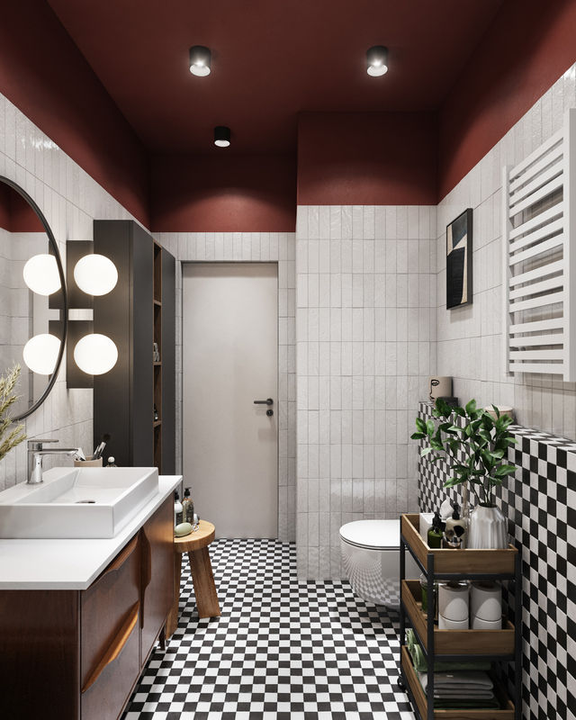 Проект яркой и красочной квартиры для семейной пары. Яркий, акцентный потолок задает настроение всему интерьеру